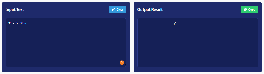 In written form, “Thank You” is displayed with dots and dashes. This visual format allows learners to understand the construction of letters, the importance of spacing, and the sequence needed for accurate Morse transmission. It is widely used in online translators and Morse code lessons.