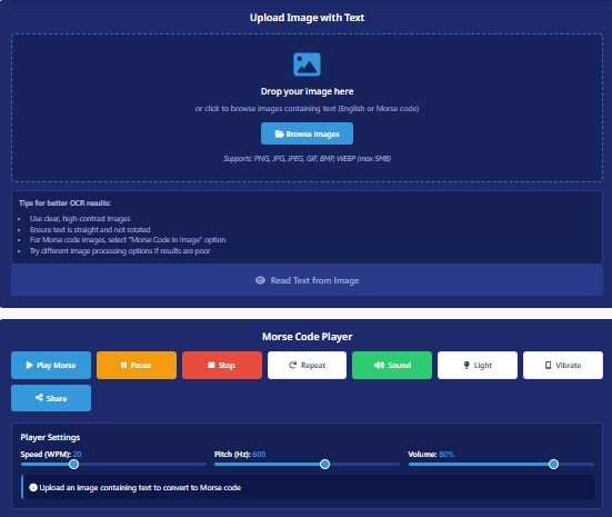 Upload any image file — a photograph, screenshot, scanned document, or sign — and the OCR engine extracts the visible text, then converts it instantly into Morse code. This tool is particularly useful for archivists working with scanned telegraph documents, students photographing text they want to encode, or puzzle designers who need to convert image-based text to Morse without manual retyping. Supports PNG, JPG, JPEG, and WEBP formats.